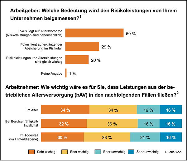 Rund 70 % der befragten Unternehmensvertreter sehen die Risikoabsicherung als „State of the Art”, also selbstverständlichen Teil der betrieblichen Altersversorgung, und wichtige Ergänzung zur gesetzlichen Absicherung an. Außerdem sehen 36 % darin einen Wettbewerbsvorteil bei der Gewinnung neuer Mitarbeiter. Im Rahmen der betrieblichen Altersversorgung liegt die Risikoabsicherung allerdings außerhalb des Fokus der Arbeitgeber, so dass es eine gesonderte Mitarbeiterkommunikation hierzu nur bei 9 % der Unternehmen gibt. „Hier gibt es deutliches Verbesserungspotenzial, denn die Unternehmen tun Gutes und reden nicht darüber,” bemerkt dazu Aon-Partner Angelika Brandl, die gemeinsam mit Senior Consultant Stephanie Zelosko die Studie verantwortet. „Wir wissen aus anderen Befragungen, dass Arbeitnehmer sehr großen Wert auf die Absicherung bei Berufsunfähigkeit und ihrer Familie im Todesfall legen. Sie sind auch bereit, dafür auf Teile ihrer Altersbezüge zu verzichten”, ergänzt Zelosko. Den Arbeitnehmern ist dabei die Absicherung gegen Berufsunfähigkeit und Invalidität wichtiger als Leistungen im Todesfall. Auf Arbeitgeberseite gibt es jedoch noch Unternehmen, die nur eine Absicherung für den Todesfall bieten. Auch im Hinblick auf die Finanzierung zeigt sich, dass Unternehmen häufiger (zusätzliche) Beiträge für die Todesfallabsicherung als für die Absicherung gegen Berufsunfähigkeit leisten. Hier bestehen also noch Möglichkeiten, durch gezielte Kommunikation und insbesondere Modifikation der Leistungen das Angebot im Sinne der Arbeitnehmer zu optimieren. In diesem Zusammenhang lohnt es sich, auch über andere Zusatzleistungen nachzudenken (Gesundheit etc.), für die Arbeitnehmer durchaus offen sind. Bei den Risikoleistungen sind flexible Lösungen mit Wahlmöglichkeiten für die Mitarbeiter gefragt, die aber bisher nur rund 20 % der Unternehmen ganz oder teilweise anbieten. „Flexibilität steht bei Arbeitnehmern ganz oben auf der Wunschliste. Das wissen wir aus mehreren anderen von uns durchgeführten Studien. Es lohnt sich also, kreative Lösungen zu entwickeln”, stellt Brandl fest. Die Arbeitgeber-Umfrage zu bAV Risikoleistungen kann hier abgerufen werden: pressegermany@aon.com. |